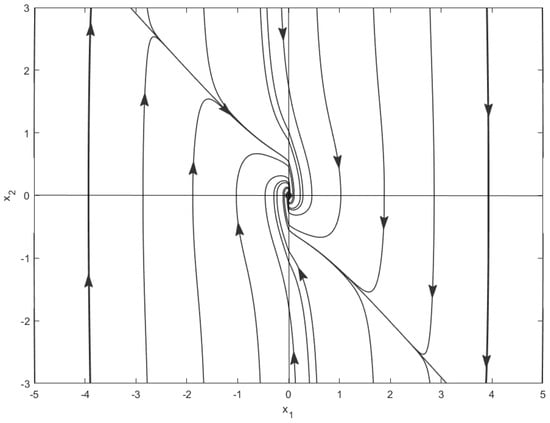 Note that T is continuous but not Lipschitz continuous at the origin. It is clear from (7) that (i) of Definition 1 is satisfied with . Now, Lyapunov stability follows by considering the Lyapunov function . Thus, the zero solution to (6) is globally finite-time stable.