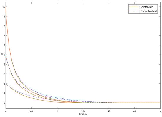 Figure 9 shows the controlled and the uncontrolled state x versus time for , and .
