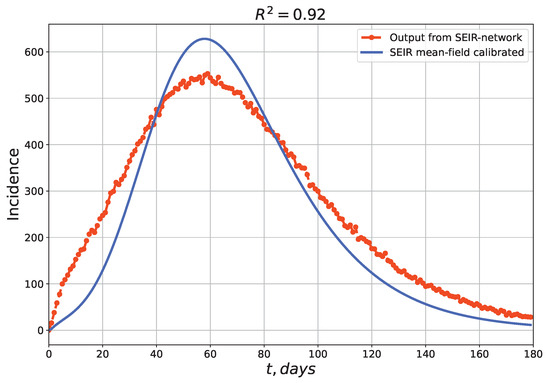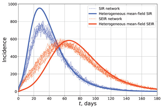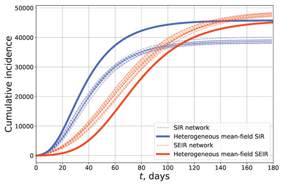Figure 1 demonstrates the comparison of newly infected cases (incidence) for SIR and SEIR network models, as well as for the mean-field models of the same population structure. Figure 2 shows a similar comparison for the cumulative number of newly infected individuals (cumulative incidence). Simulations for all models were conducted using the same parameters. The changes in the dynamics of epidemic indicators for heterogeneous mean-field models correspond to similar changes for network models when transitioning from the SIR to the SEIR type. A similar change in the shape of disease incidence curves may be observed when transitioning from the SIR to the SEIR compartments in the case of basic compartmental models. As can be seen in the graph, the mean-field models demonstrate higher incidence compared to network models. This discrepancy is related to the nuances of the mean-field approximation. A similar effect was described for SIR models in [6]. At the same time, it is shown that different types of models (network and mean-field) within one population structure (SIR or SEIR) can be used interchangeably with some parameter adjustment since they produce epidemic curves of similar shape. This is demonstrated in Figure 3, where we present the calibration of the SEIR heterogeneous mean-field model to the output data from the SEIR network model. While the mean-field approximation tends to overestimate incidence rates in comparison to the network model, it can be calibrated to align with the network model’s values and effectively reproduce the epidemic dynamics on networks ().