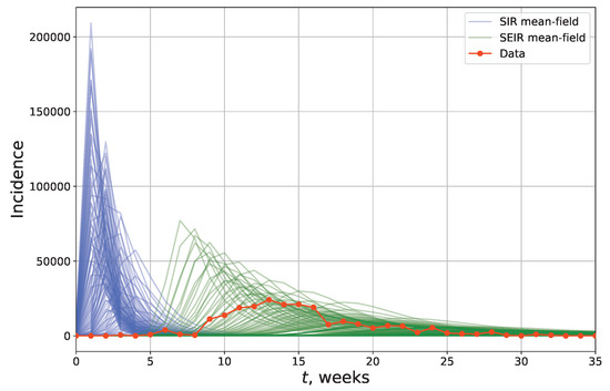 Simulated incidence generated by SIR and SEIR mean-field models against incidence data for 2014–2015 influenza epidemic season in St. Petersburg, Russia. Barabási–Albert network with nodes and , , , , .