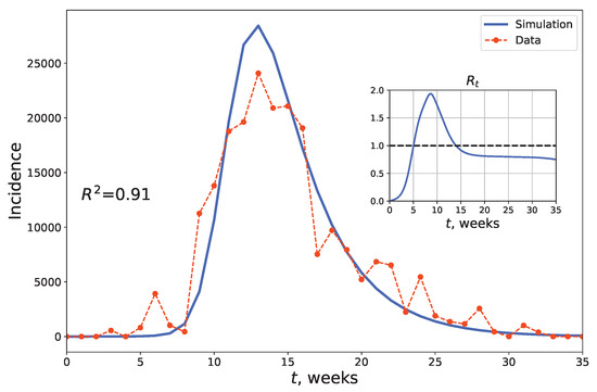 To demonstrate the ability of the SEIR heterogeneous mean-field model to replicate real epidemic data, we consider the influenza epidemic season of 2014–2015 in Saint Petersburg, Russia. In Figure 4, we demonstrate the results of a parameter sweep of our mean-field SEIR model compared to the original mean-field SIR model from the library [15] with the real epidemic data in the background. As one can see, the modeling curves produced by an SEIR model presented in this paper have a shape more similar to real incidence compared to an SIR model. We might assume nonetheless that the calibration of an SIR model to incidence datasets for Russian cities instead of an SEIR model is theoretically possible, but this would cause problems in the correct interpretation of resulting optimal parameter values. Particularly, by assuming that the modeled disease, either influenza or COVID-19, has no incubation period, we will inevitably add errors to the assessed values of transmission intensity and effective reproduction number . The results of SEIR mean-field model calibration to weekly incidence data are shown in Figure 5. The optimal parameters were calculated using manual and automatic calibration. Ultimately, we were able to accurately replicate the incidence curve ().
