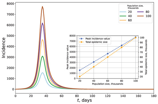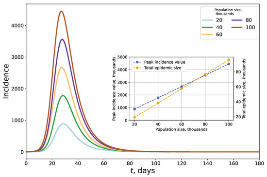 To reduce the simulation time for the network model, sampling can be employed. To correctly scale from a large population to a smaller one, it is necessary to determine a transformation that allows the conversion of the incidence curve of the small population to the large population case. Particularly, this is a great obstacle for the application of multi-agent models in epidemic surveillance, which our previous studies showed. Figure 6 and Figure 7 show the results for incidence simulation as a function of time using an SEIR heterogeneous mean-field model. In the inset plots, we demonstrate that, due to the properties of regular networks (Barabási–Albert and Watts–Strogatz types), the peak incidence rates and the total number of infected individuals throughout the epidemic increase linearly with population size. Thus, the simulation time using network models can be reduced by decreasing population sizes, and, after the simulation, target epidemic values can be recalculated based on this linear relationship. This is generally not true for the multi-agent models that use synthetic populations because the structure of contacts in such populations may be intricate and cannot be easily sampled.