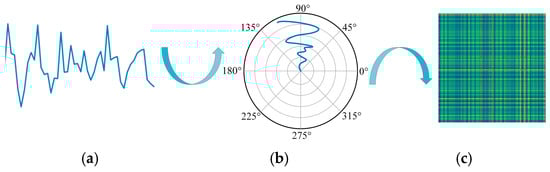 GADF is a data dimension transformation method based on a polar coordinate Gram matrix, which can retain and transfer 1D time series gear vibration information into image texture features and realize feature visualization [37]. Its coding process is shown in Figure 1. The Gram matrix is composed of inner products between vectors, which can maintain the time dependence of the time series. Every element in the matrix denotes the cosine angle between two time points. Assuming that the X = (Xi, i = 1, 2, … N) is a time series data point with N samples, the transition progress X by GADF is as follows: