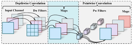Depthwise separable convolution (DSC), as a common convolutional operation in CNN, is extensively utilized in fault diagnosis models such as MobileNet [38], ConvNeXt [39], and Xception [40] because it can maintain a good performance and greatly reduce computing time and model parameters, which improve the efficiency and speed of the diagnostic model. DSC primarily reduces computational and parametric complexity calculations and parameterized complexity by performing separate convolutions in different data channels; this process consists of two parts: depthwise convolution (DW) for extracting spatial features and point convolution (PW) for extracting channel features. The schematic diagram of DSC is displayed in Figure 2.