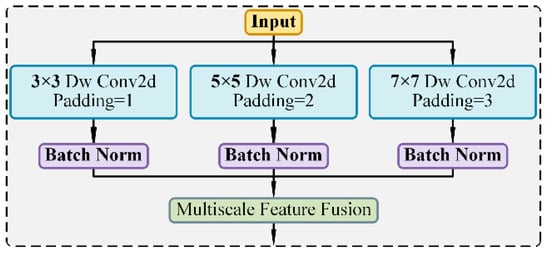 Combined with depth-separable convolution, a high-efficiency multi-scale feature extraction architecture is shown in Figure 3. The multi-scale feature extraction module has three parallel branches, and the sizes of convolution kernel on each branch are 3 × 3, 5 × 5, and 7 × 7, respectively. In addition, the filling parameters of each convolution kernel are set to 1, 2, and 3, which can ensure that the different scale features introduced into the fusion layer display the same dimensions. Finally, a batch normalization (BN) layer is added at the end of each branch to reduce the risk of over-fitting. The main function of the BN layer is to normalize each batch input data point, which makes network training more stable and faster, as shown below: