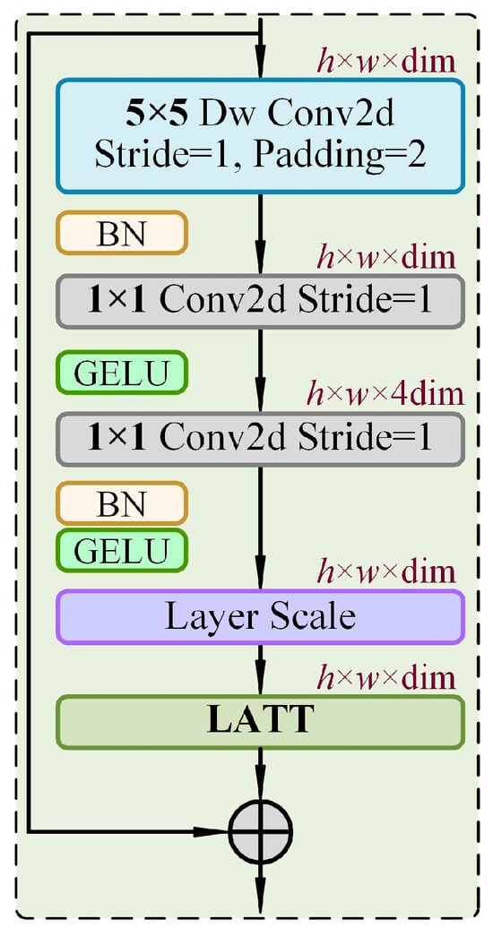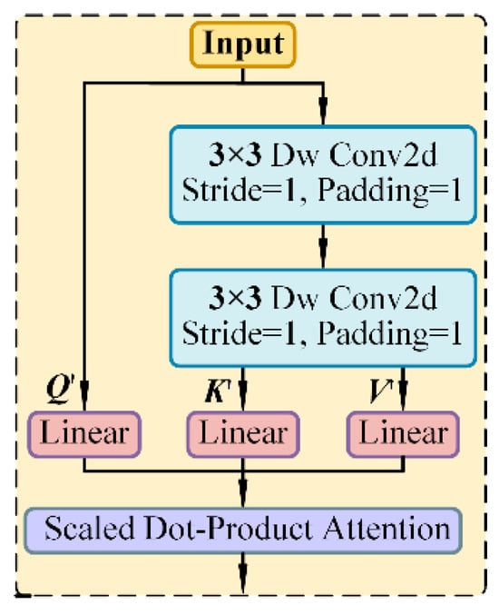 To reduce the computational costs brought by pooling attention and decrease the spatial size of K and V, two 3 × 3 depthwise separable convolution layers were included. The framework of the proposed LATT module is shown in Figure 4. and . In other words, the relative position deviation B is added to each self-attention module, which generates a lightweight multi-head attention mechanism, and the formula is as follows:
