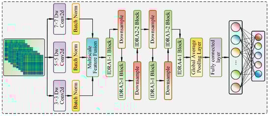 In this section, the architecture of proposed compressive sensing lightweight attention multi-scale residual network is displayed in Figure 6. It can be seen intuitively that the input of CS-LAMRNet is a two-dimensional image of the 1D vibration signal converted by GADF. Firstly, the feature information is fully extracted by MSFE branches with three different convolution kernels and BN layers, and then the extracted features are fused as the input of the backbone network. The backbone network of the model is represented by the stack of IDRA modules in the following order: 1, 2, 2, 1. After repeated tests, the dim of each group was set to 96, 192, 384, and 768 to further process the feature information. A downsampling module was placed between each stack block, which consists of BN layer with step size of 2 and convolution kernel of 2 × 2, so as to reduce the space size of feature images and thus reduce the complexity of the model. Finally, the learned features were input into the GAP and the average values of each feature image were calculated, which significantly reduced the number of parameters in the full connection layer, and the classification of the fault types was completed by SoftMax. The specific parameters of each network layer of CS-LAMRNet are shown in Table 1.