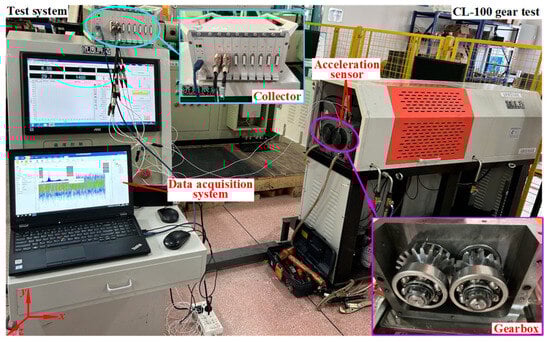 To obtain gear status and fault data, a CL-100 gear wear testbed was set up, as shown in Figure 8. The gear experiment table consists of a gearbox, a DH5922D dynamic signal test system, a loading device, an acceleration sensor, etc. The gear vibration data sampling frequency was 20 kHz, the sampling time was 20 s, and the gear speed was set to 1450 r/min. The main parameters of the gears are listed in Table 2. The experimental platform has five states, namely normal gear (NO), tooth break (MT), tooth pitting (CT), tooth crack (RF), and tooth wear (SF), which are displayed in Figure 9.