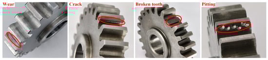Gear is the core unit of power transmission in rotating machinery, which is widely used in the aerospace, rail transit, wind energy, and ship industries, as well as in other fields. Its reliability directly affects the performance and life of equipment [1,2]. Affected by complex working conditions and load impact, gears are prone to various faults, such as cracks, pitting, wear, spalling, and broken teeth, resulting in mechanical structure failure, equipment shutdown, casualties, and other consequences [3,4,5]. Therefore, research on gear fault diagnosis (GFD) technology in complex environments is of great significance for equipment condition monitoring, maintenance reduction, and reliability improvement [6,7].