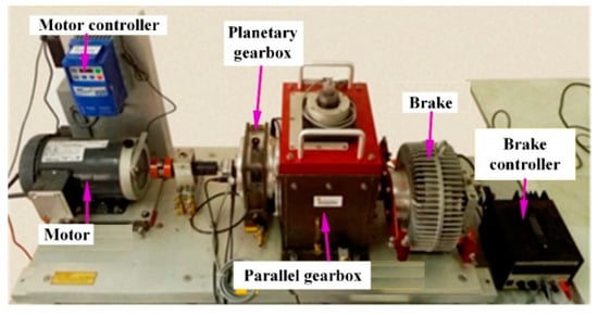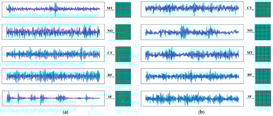 The SEU gear dataset of gearbox was acquired from the dynamic drivetrain simulator (DDS), as presented in Figure 11, which consists of motor, motor controller, parallel shaft gearbox, load, and load controller. Two different conditions (1200 r/min at 0 Nm and 1800 r/min at 7.32 Nm) were selected and researched [41]. The SEU dataset contains multi-type data and the vibration signal of gearbox in x-axis was selected under the first condition. The dataset contains four common gear faults and normal gearbox data: tooth pitting (CT), root fault (MT), tooth break (RF), tooth wear (SF), and normal state (NO). Each fault type adopts a 1000-data point sliding window for feature extraction and the training datasets are converted into 5000 images by GADF. Figure 10b shows the GADF images of SEU datasets. Subsequently, each fault type contains 800 training samples and 200 test samples. A detailed description of the different types of faults for gearboxes is given in Table 4. In order to better compare the differences and connections between the two datasets, we summarize the missing datasets in Table 5.