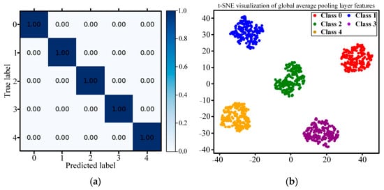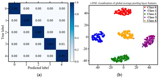 The visualization results of CS-LAMRNet for SEU dataset. (a) Confusion matrix; (b) t-SNE visualization.