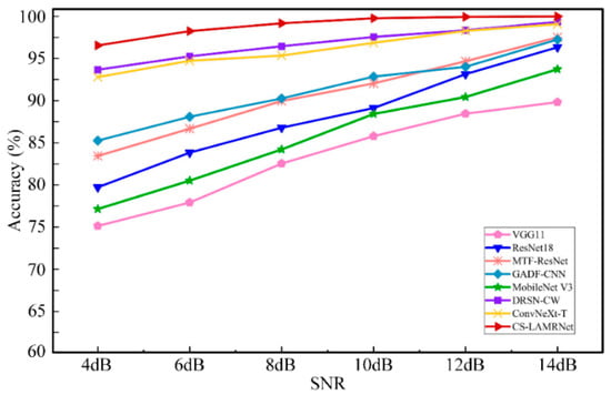 To ensure the consistency of the analysis, the several diagnostic methods mentioned above were used for comparison. The comparison experiments were carried out using the SEU dataset with different SNRs (4 dB, 6 dB, 8 dB, 10 dB, 12 dB, and 14 dB), which are shown in Figure 16. From the line chart in Figure 16, it can be observed that the accuracy of the proposed CS-LAMRNet shows better diagnostic ability under the examined SNRs than the seven other approaches. When SNR = 4 dB, the accuracies of VGG11, MobileNet V3, ResNet18, MTF-ResNet, and GADF-CNN are all below 86%, while the accuracies of ConvNeXt-T, DRSN-CW, and CS-LAMRNet remain above 92.5%. With increasing SNRs, it can be concluded that the proposed CS-LAMRNet model has the highest diagnostic accuracy rate of 100% when SNR ≥ 12 dB. Therefore, the results show that the proposed CS-LAMRNet model possesses excellent noise resistance properties.