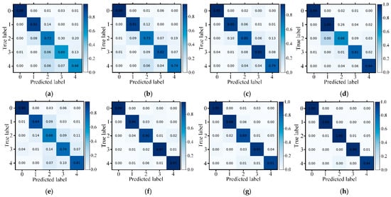 Confusion matrices for the gear damage classification of the SEU dataset with noise. (a) VGG11; (b) ResNet18; (c) MTF-ResNet; (d) GADF-CNN; (e) MobileNet V3; (f) DRSN-CW; (g) ConvNeXt-T; (h) CS-LAMRNet.