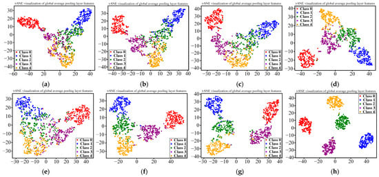 Visualization for the gear damage classification of the SEU dataset with noise. (a) VGG11; (b) ResNet18; (c) MTF-ResNet; (d) GADF-CNN; (e) MobileNet V3; (f) DRSN-CW; (g) ConvNeXt-T; (h) CS-LAMRNet.