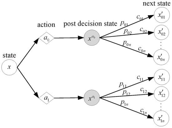 However, as Refs. [53,54] pointed out, the Rollout algorithm is time-consuming for large-scale problems due to the extensive simulation required. They proposed a more efficient rollout algorithm called post-rollout (PRollout). The PRollout algorithm starts the simulation from the post-decision state () after a decision has been made, showed in Equation (11). The authors demonstrated that this algorithm significantly reduced the computational time compared with the one-step rollout.