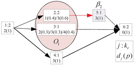 Figure 5 presents an example of a simple project with a flexible structure and uncertain activity durations. The project contains a selection where the triggering activity is activity 1 and the optional activity set is . Activity 5 is dependent on activity 2. The duration of activity 2 has a 0.4 probability of being 1 and a 0.6 probability of being 3. The duration of activity 3 has a 0.3 probability of being 2, a 0.3 probability of being 3, and a 0.4 probability of being 4. The maximum resource is assumed to be 2.