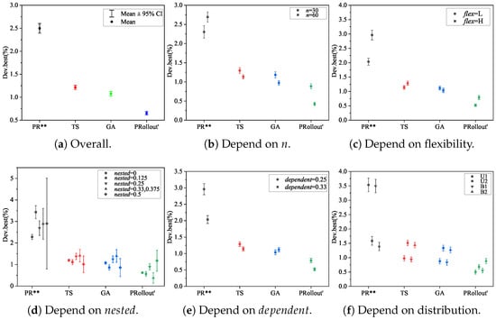 It can be observed that the performance of each method in the continuous duration problem is generally consistent with that in the discrete triangular distribution problem. Specifically, the PRollout’ algorithm still outperforms others. Among all algorithms, no significant difference exists between TS and GA, while other pairwise comparisons show statistically significant differences. This is because the variances of uniform and Beta distributions are larger than those of triangular distributions, and the increased randomness masks the differences between metaheuristics. Figure 9 displays the 95% confidence intervals for each algorithm at each factor level, and Figure 9f illustrates the impact of variance on algorithm performance when durations follow uniform or Beta distributions. It is evident that higher variance (i.e., greater randomness) degrades the performance of both the PRollout’ algorithm and metaheuristics.