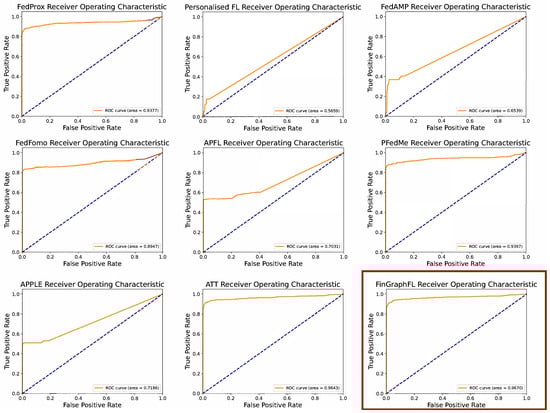 Although the aforementioned models exhibit commendable accuracy, their performance in handling imbalanced datasets is less than optimal when assessed using the ROC-AUC curve. This is evident from their results on the highly imbalanced 2018CN dataset, as shown in Figure 3. The ROC-AUC curve is an essential metric for evaluating a model’s performance on imbalanced datasets because it assesses both the sensitivity and the false positive rate. In contrast, FinGraphFL not only maintains high accuracy, but also excels with its ROC-AUC score. It achieves an area under the ROC curve of 0.9670, demonstrating a robust ability to effectively manage imbalanced datasets. The reality of credit card fraud detection involves inherently imbalanced datasets where fraudulent transactions are much less frequent than legitimate ones. The ability of FinGraphFL to maintain high accuracy and an impressive ROC-AUC score under such conditions is particularly significant, highlighting its effectiveness in real-world scenarios of credit card fraud detection. This highlights its potential and importance as a practical tool in the field, adept at navigating the complexities of imbalanced data.