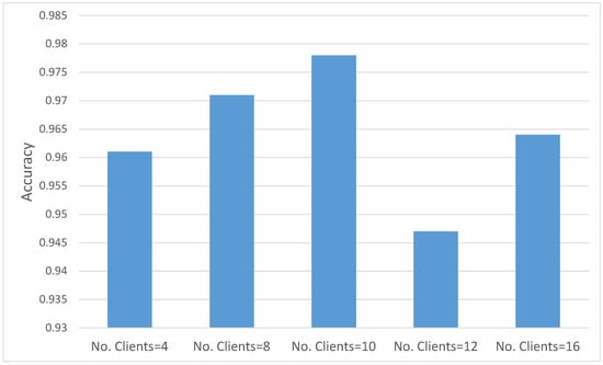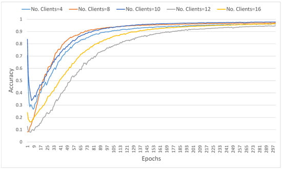 Figure 7 demonstrates several key convergence properties: First, all configurations begin with comparable initial accuracy, confirming consistent initialization. The four-client and eight-client models show rapid convergence, benefiting from richer local datasets. Notably, the 10-client configuration combines the fastest convergence with highest final accuracy, representing the ideal operating point. While 12-client and 16-client setups require more epochs to stabilize, they ultimately achieve comparable performance levels, demonstrating the framework’s resilience to federation scale.