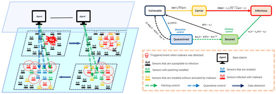 As illustrated in Figure 1, five compartments are introduced to describe different states of nodes and its propagation process is demonstrated. Sensors with vulnerabilities become V-nodes, and once attacked, these nodes may enter a dormant state. These nodes are referred to as C-nodes. Taking into account the temporal nature of malware infection, after a certain time , the malware becomes activated. Nodes carrying the malware will be infected and propagate the malware to attack other nodes. Such nodes are referred to as I-nodes. Over time, some infected I-nodes are repaired through manual intervention, becoming S-nodes that are no longer susceptible to the infection. After a period of time , the effectiveness of the patching program decreases for S-nodes, causing them to revert back to V-nodes. In addition to this, V-nodes can be quarantined and protected manually, transforming into Q-nodes. After some time, certain Q-nodes are no longer protected and revert back to vulnerable V-nodes, while some Q-nodes are patched and become S-nodes. The remaining nodes are kept quarantined for continued protection.