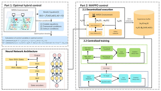 Part 1 presents the derivation flowchart for optimal hybrid control systems. Part 2 illustrates the hierarchical control architecture of the MAPPO framework, specifically highlighting two decentralized executions with centralized training modules (2.1 and 2.2) responsible for agent-level decision-making under decentralized constraints. Notably, the model’s neural network architecture is depicted in the lower left corner (Remark 5), detailing the distributed policy and value function approximation modules critical for decentralized execution with centralized training.