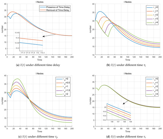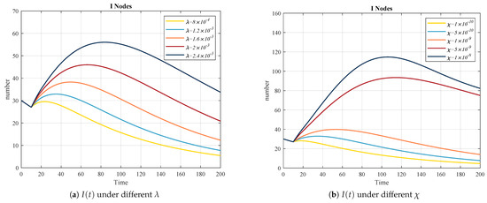 Unlike the conventional isolation measure models of other wireless radar sensors [33,34], the isolation time-lag and attenuation are taken into account in this study. In the kinetic Equation (3), represents the isolation decay parameter, whose value is jointly determined by parameters h and ζ. From the perspective of real-world scenarios, isolation measures are not absolutely effective. Taking h as the isolation time-lag coefficient as an example, when the value of h increases, the value of decreases accordingly. This indicates that the degree of attenuation of the isolation effect intensifies. Incorporating into the equation system of the malware propagation model can more accurately depict the internal relationship between the dynamic evolution process of the node states within the system and the isolation measures. Thus, it provides a solid theoretical basis for designing highly efficient and practical malware propagation control strategies.