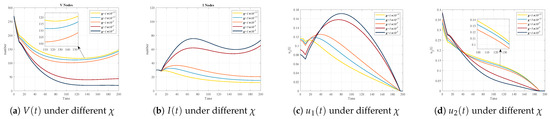 As shown in Figure 6, as the transmit power coefficient increases, the number of I-nodes also rises significantly, and the magnitude of this increase is much greater than that observed with changes in node density. This indicates that transmission power has a more pronounced impact on the propagation dynamics of the channel model. Additionally, as increases, both the patching-control and quarantine-control of the optimal control strategy exhibit significant variations. This demonstrates that changes in transmission power simultaneously and significantly affect the optimization of both patching- and quarantine-controls. Due to the more pronounced impact of transmission power variations on the control strategy, the system exhibits higher sensitivity and relatively poorer stability.