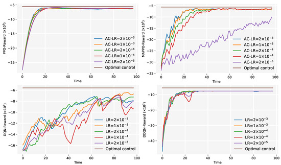 The learning rate is the most critical hyperparameter that affects the performance of RL. As shown in Figure 7, PPO and MAPPO still converge under different learning rates for the policy network (A-LR) and the value network (C-LR). As the learning rate decreases, the convergence speed slows down. Among them, PPO is less affected by the learning rate, while MAPPO’s convergence is more sensitive to the learning rate. The convergence curve of DQN fluctuates significantly, resulting in poorer convergence performance. As the upgraded version, DDQN shows a smoother convergence curve with better convergence performance.