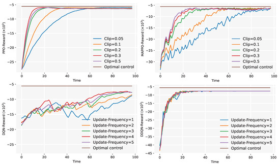 In Figure 8, the clip value in PPO is adjusted to prevent significant changes in the policy and value functions between iterations. The clipping strength is controlled by the hyperparameter “clip”, where a larger clipping strength results in larger updates to the policy and value functions. As shown in Figure 8, PPO and MAPPO still converge under different clipping parameters. In contrast to PPO and MAPPO, the update frequency of DQN and DDQN algorithms is treated as a variable in the convergence experiments. The experimental results still show that DQN has poor convergence, while DDQN exhibits better convergence with minimal sensitivity to the changes.