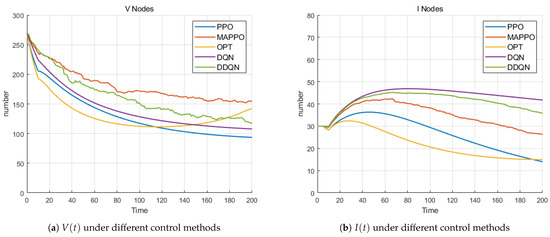 In the proposed model, the key nodes, denoted as V and I, serve as the primary control indicators. As illustrated in Figure 11, the propagation graphs for the V-nodes and I-nodes under different algorithms with the same parameters ( = 1.2 and = 5 ) are presented. In Figure 11b, it is observed that the optimal control results in the fewest I-nodes, followed by PPO, MAPPO, DDQN, and DQN. Correspondingly, the total control costs for each algorithm under the given parameters are shown in Table 4. The total cost for optimal control is 5595.56, while for PPO it is 5955.67, MAPPO yields 6456.52, DDQN results in 7145.24, and DQN reaches 7197.03.