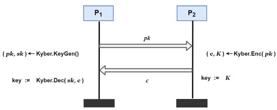 Key Exchange (KE) allows two entities to negotiate a key over a public channel. The key is only known to the two parties, and an adversary cannot obtain any information about the key from the communication. The Diffie–Hellman key agreement, a well-known KE [28], guarantees key security based on the discrete logarithm problem. In a classical computing environment, the problem requires a super-polynomial time solution, but a quantum computer can crack the discrete logarithm problem in polynomial time using the Shor algorithm. Therefore, we choose a CCA-secure KEM Kyber [13] as our post-quantum key exchange protocol. We chose Kyber over Newhope or other solutions for our key exchange protocol because it was one of the final algorithms screened by the NIST Post-Quantum Cryptography Competition as providing secure key exchange and encapsulation capabilities that can withstand attacks from quantum computers.