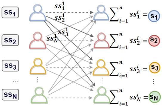 The secret sharing scheme was first introduced by Shamir et al. [29] and Blakley et al. [30] in 1979. Throughout this paper, threshold secret sharing scheme refers to Shamir’s scheme. The quantum-resistant security of the Shamir secret sharing scheme is essentially due to its information-theoretic security design, which achieves unconditional security through an algebraic structure of polynomial interpolation. Its core property ensures that if the number of participants is less than a threshold t, i.e., if or less shares are obtained, these shares do not provide any information about the secret value S. Security is guaranteed by the mathematical structure, not by the assumption that it is “computationally hard to break”. While quantum computers can solve certain computationally hard problems, such as the Shor algorithm for breaking RSA and ECC, they cannot break the bounds of information-theoretic security. Informationally secure schemes are theoretically secure against any computational power, including quantum computers, because their security does not depend on the limits of the attacker’s computational resources. In the secret sharing scheme, a secret value S is split into n shares, each distributed to a participant. Reconstruction requires at least t participants, while fewer than t reveal no information about S.
