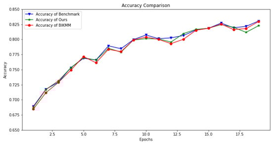 An accuracy and loss comparison between our proposed scheme, the classical work BIKMM [8], and the benchmark experiment (i.e., federated learning without privacy protection) is illustrated in Figure 4 and Figure 5. In Figure 4, the number of global training rounds (Epochs) was set to 20, the number of local training rounds was 3, the federated learning model employed was ResNet-18, and the dataset used was CIFAR-10. The accuracy ranged from 68% to 83%. Notably, the accuracy started at 68% in the first round, which was attributed to the pretraining process. Specifically, we initialized the model using a pretrained ResNet available in the ‘models’ module of ‘torchvision’.