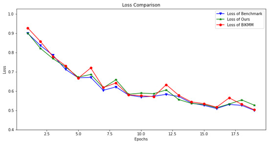 Similarly, Figure 5 presents a loss comparison under the same experimental settings as Figure 4. The loss values range from 0.92 to 0.50. Over the course of 20 global training rounds, the loss trend of our proposed scheme (green star-marked curve) remained closely aligned with the benchmark experiment (blue triangular-marked curve). In contrast, the loss curve of BIKMM (red circular-marked curve) exhibits a greater fluctuation than our approach. This indicates that our mask-based privacy-preserving scheme had minimal impact on the stability of federated learning and maintained a more consistent training performance across the 20 global rounds.