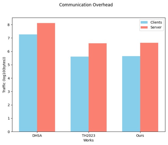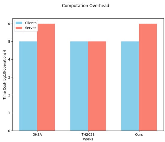 The computational overhead of TH on the server side is mainly from decrypting the aggregated model at each iteration, with a complexity of , where l is the length of the model and is the overhead of having to reconstruct the secret in the presence of a client dropout. However in cross-silo federated learning, there is no need to consider the overhead of a client dropout, and thus only is required, which is the same as the overhead of a client encrypting the local model parameters. This is less than our server-side overhead. Furthermore, an analysis of the server-side computational overhead of the DHSA scheme reveals a similar overhead to that observed in our scheme. Our computational overhead was slightly higher than TH, by 2%, on the server side.