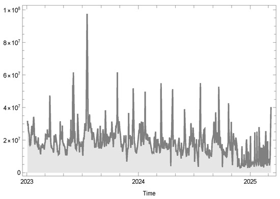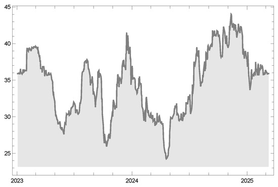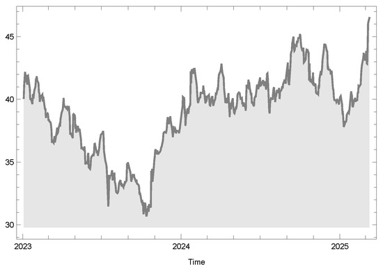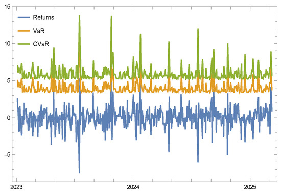 Table 3, where the estimation of the process parameters is carried out utilizing the maximum likelihood method. The sample selection in this study is motivated by the objective of evaluating risk measures within a representative and diversified equity market environment. The time period from January 2023 to March 2025 was selected to capture recent post-pandemic market dynamics, ensuring the applicability of the findings to contemporary financial risk management practices. This choice provides a comprehensive basis for assessing the performance of the proposed chi-squared-based VaR and CVaR measures under real-world conditions.