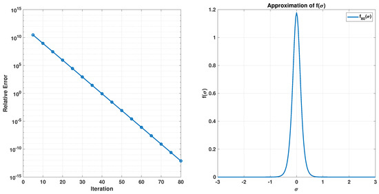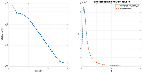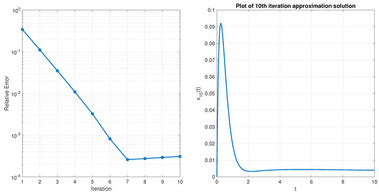 Relative errors for Example 5 in different iterations for , are depicted on the left of Figure 10, and the approximate solution after eighty iterations is presented on the right of Figure 10.