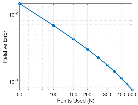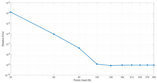 In this example, since the exact solution is not available, we set , , and iterations to evaluate the reference solution. Relative errors for Example 2 in different iterations for and are depicted on the left of Figure 3, and the approximate solution after fifteen iterations is presented on the right of Figure 3. It is easy to verify that the solution of the equation belongs to the ball and tends to zero at infinity uniformly with respect to the ball It is easy to derive that by increasing the number of iterations, relative errors decrease. To show how the number of used points (N) affects accuracy, relative errors are depicted for the 15th iteration for different values of N in Figure 4. From this, it is obvious that by increasing used points, the relative errors decease.