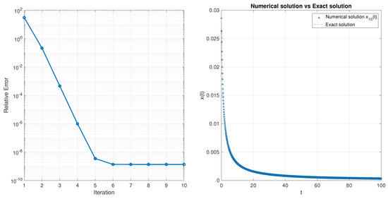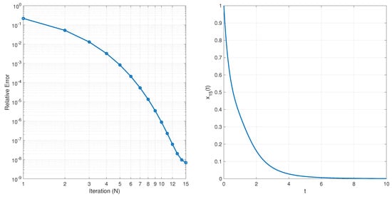 In this section, we employ the proposed numerical method to obtain an approximate solution of some Hammerstein integral equations. Before proposing some examples, we define a relative error as where and are the exact and ith approximate solution, respectively. If the exact solution is not available, we set a very large number for i to compute the ith solution and use it as the reference solution and exact solution. We used MATLAB (https://www.mathworks.com/products/matlab.html, accessed on 21 April 2025) with an 11th Gen Intel Core i7 processor and 16 GB RAM to perform all computations.