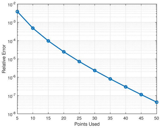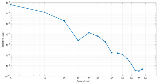 Relative errors for Example 3 in different iterations for , are depicted on the left of Figure 5, and the approximate solution after ten iterations vs. the exact solution are presented on the right of Figure 5. It is easy to verify that the solution of the equation belongs to the ball and tends to zero at infinity uniformly with respect to the ball It is easy to derive that by increasing the number of iterations, relative errors decrease. To show how the number of used points (N) affects accuracy, relative errors are depicted for the 10th iteration for different values of N in Figure 6. From this, it is obvious that by increasing used points, relative errors decease.