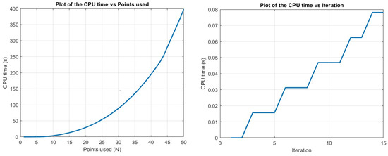 Relative errors for Example 4 in different iterations for , are depicted on the of left Figure 7, and the approximate solution after fifteen iterations vs. the exact solution is presented on the right of Figure 7. It is easy to verify that the solution of the equation belongs to the ball and tends to zero at infinity uniformly with respect to the ball It is easy to derive that by increasing the number of iterations, relative errors decrease. To show how the number of used points (N) affects accuracy, relative errors are depicted for the 10th iteration for different values of N in Figure 8. From this, it is obvious that by increasing used points, relative errors decease. Also, to show the computational complexity of the proposed algorithm, the CPU times are depicted in Figure 9 for different numbers of iterations and Sinc points used.