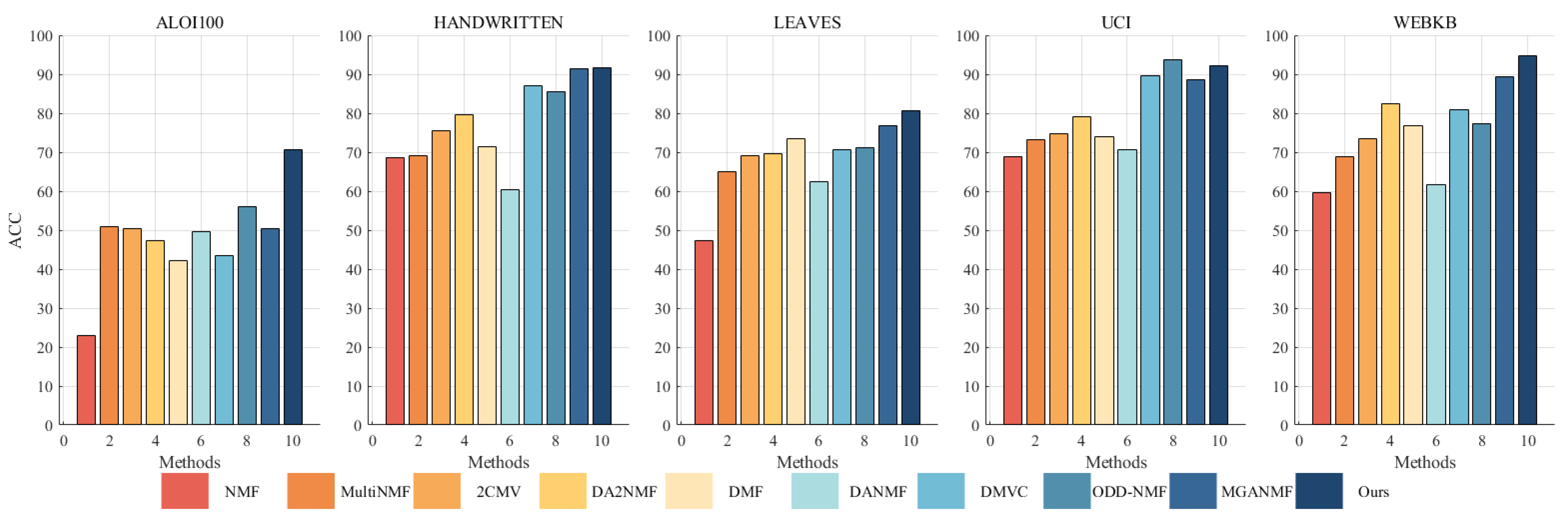 37]: It employs an autoencoder-inspired NMF model to learn linear low-dimensional features and introduces adaptive graph learning to capture nonlinear data structures. In addition, a dual auto-weighted strategy is developed to compute weights for different views.