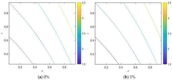 In this problem, an grid of nodes is set up within the domain, and a grid of nodes is placed on each face of boundary . The PSO algorithm optimizes the optimal Cindex . Figure 11 illustrates the field temperature on the left boundary of the cube under random noise interference at various levels. The solid and dotted lines represent the exact solution and the numerical solution obtained using the ICRBF as the kernel function, respectively. It is evident that the temperature recovered by the proposed method aligns more closely with the exact solution as the noise level decreases. Figure 12 displays contour plots of the relative error in temperature at the right boundary under noise perturbation. Table 3 lists the relative errors of the temperature, which varies slowly with an increasing number of configuration points in the domain, even after applying 1% noise. Figure 11 and Figure 12 and Table 3 demonstrate that the ICRBF-based Kansa method produces highly accurate solutions even in the presence of noise. Finally, Figure 13 depicts the RMSEs of temperature and heat flux at test points under different shape parameters on the unknown boundary, as well as the condition number of the numerical matrix. For the inverse problem of steady-state heat conduction with variable coefficients composed of trigonometric functions in analytical solutions, the traditional GA-RBF cannot obtain accurate numerical solutions, and the ICRBF can not only obtain more accurate numerical solutions but also obtain stable numerical solutions in terms of shape parameters.