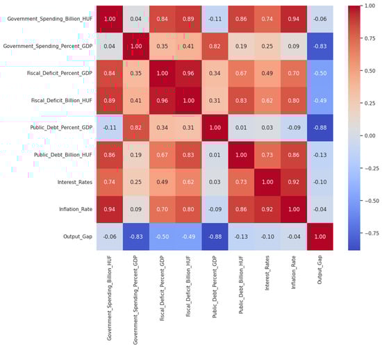 Figure 1 provides insights into the relationships between fiscal and monetary variables. There is a strong positive correlation (0.94) between government spending (in HUF billion) and the inflation rate, suggesting that increased government spending was associated with higher inflation during this period. Similarly, the high positive correlation between interest rates and inflation rate (0.92) indicates that the central bank adjusted interest rates in response to inflationary pressures. The strong positive correlations between government spending and fiscal deficits (both in percent of GDP and in HUF billion) highlight how increased spending contributed to higher deficits. Moreover, the negative correlations between the output gap and both government spending as a percentage of GDP (−0.83) and public debt as a percentage of GDP (−0.88) suggest that higher relative government spending and debt levels were associated with lower economic output, possibly due to crowding out private investment or inefficiencies in public expenditures. These findings underscore the complex interplay between fiscal expansion, monetary policy adjustments, and macroeconomic stability in the face of significant events like the pandemic and geopolitical tensions.