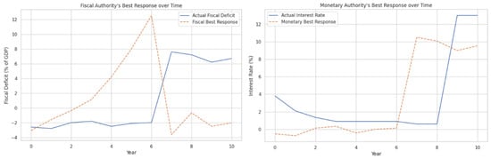 Using the above functions, we calculated the best response strategies for each authority over the period. The results are presented in Table 3 (see Figure 2 for a similar visual representation). The simulated best response strategies reveal important insights into the strategic interactions between Hungary’s fiscal and monetary authorities. During the early period (2013–2015), the fiscal best response deficits were close to the actual deficits, indicating alignment with the optimal response given the monetary policy stance. However, in the middle period (2016–2019), the fiscal best response suggested moving towards surpluses, contrary to the actual continued deficits, implying that more expansionary policies could have been adopted. During the COVID-19 pandemic (2020–2021), the fiscal best response turned negative, suggesting tighter fiscal policy than the actual large deficits aimed at mitigating the pandemic’s economic impact. For the monetary authority, during the early period (2013–2015), the best response interest rates were negative or very low, indicating a need for more accommodative policies. During the pandemic and its aftermath (2020–2023), the best response interest rates were significantly higher (around 9–10%) compared to the actual low rates, suggesting that earlier rate increases would have been optimal in response to large fiscal deficits and rising inflationary pressures. The discrepancies between actual policies and best response strategies highlight a lack of coordination between the fiscal and monetary authorities. During the pandemic, expansive fiscal policies (large deficits) were adopted to counteract the economic downturn, while low interest rates were maintained. This combination may have exacerbated inflationary pressures. The sharp increase in interest rates in 2022 and 2023 to 13% reflects a delayed response by the monetary authority to rising inflation, aligning more closely with the best response during these years.