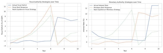 During the COVID-19 pandemic (2020–2021), the Nash equilibrium strategies adjusted to the economic downturn, recommending fiscal deficits of −3.04% and −0.93% of GDP to support the economy. The actual fiscal deficits were significantly larger, at 7.6% and 7.2% of GDP, indicating a more aggressive fiscal response to the crisis. While expansive fiscal policy was necessary to mitigate the pandemic’s impact, the magnitude of the deficits exceeded the equilibrium suggestions, potentially exacerbating public debt concerns. In terms of monetary policy, the Nash equilibrium recommended maintaining low or even negative interest rates during the pandemic, with rates at −0.99% in 2020 and 1.29% in 2021. The actual interest rates were slightly higher at 0.60%, aligning relatively closely with the equilibrium strategies, suggesting that the monetary authority’s actions during the pandemic were more in line with the theoretical optimal strategies. In the post-pandemic period (2022–2023), the Nash equilibrium strategies indicated a return to modest fiscal surpluses and gradual monetary tightening, with equilibrium interest rates rising to 3.47% and 3.84%. However, the actual fiscal deficits remained high at 6.2% and 6.7% of GDP, deviating from the equilibrium’s recommendation for surpluses. The monetary authority implemented sharp interest rate increases to 13.00% in both years, significantly exceeding the Nash equilibrium suggestions. This aggressive monetary tightening likely reflects attempts to combat rising inflation and stabilize the currency in the face of external pressures, such as the economic repercussions of the Ukraine war and global supply chain disruptions.