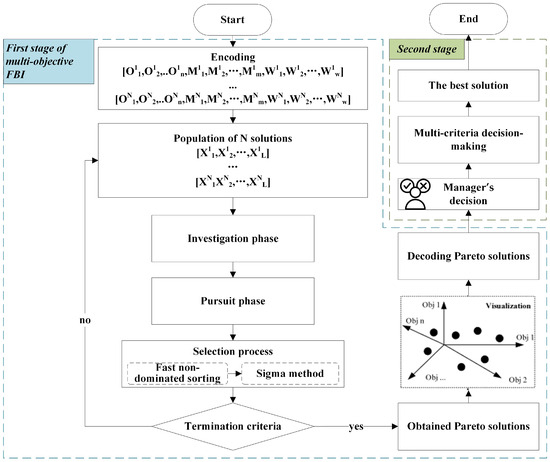 The proposed algorithm, called the TSFBI algorithm, for solving the DRFJSP consists of a Pareto optimization phase and a multi-criteria decision-making phase. In the Pareto optimization phase, a discrete multi-objective version of the FBI algorithm is used to obtain the Pareto solutions of the DRFJSP. On the other hand, the multi-criteria decision-making phase involves the selection of the best solution from the Pareto solutions. Figure 1 illustrates the main components of the TSFBI algorithm, which is executed according to the following steps.