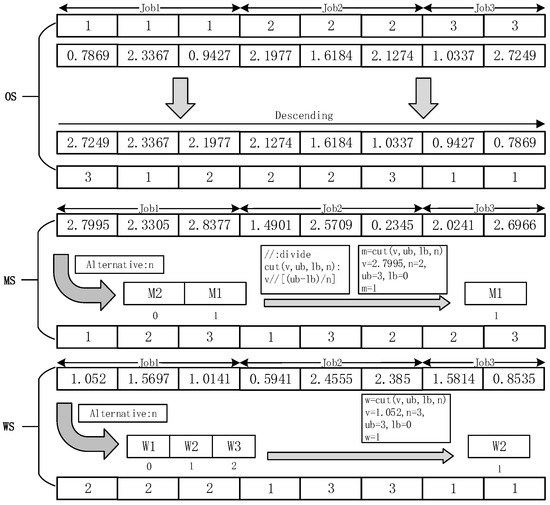 As the chromosome encoding sequence is a three-dimensional real number vector, three mapping relations exist for the encoding parts. Each mapping relation consists of a real part and an integer part, and each mapping relation has a real part and an integer part with different meanings due to the difference in the meaning of the sequences. In the OS, the real part represents the sorting rule, and the integer part represents the process number, i.e., the size of the real value determines the ordering of the elements in the integer part (descending order is used here). In the MS and WS, the real part represents the selection rule, and the integer part represents the number (we obtain the selected number by segmenting the selectable set and mapping the real numbers onto the corresponding interval segments, the algorithmic procedure for which is shown in Algorithm 1). The example shown in Figure 2 includes three jobs, the first and second with three operations and the third with two operations.