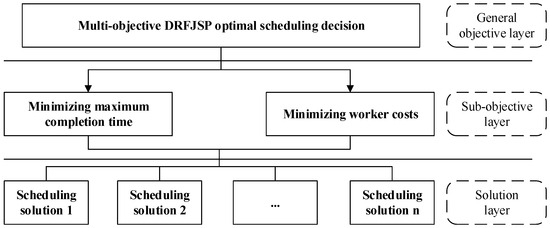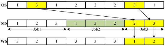 The decoding process is referred to in Gong’s article [14], and the specific process is shown in the example in Figure 3, which indicates that the DRFJSP’s genetic code includes a three-layer genetic coding sequence for the OS, MS, and WS. The length of the process sequencing sequence is the sum of all operation processes.