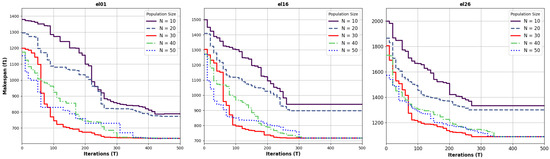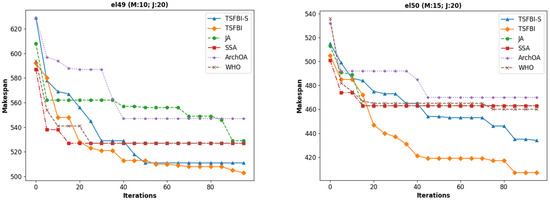 As shown in Figure 9 and Table 6, the TSFBI algorithm significantly outperformed the well-established NSGA-II algorithm across the tested instances (el01–el40). Specifically, the superior C-metric values indicate that the TSFBI generates Pareto sets with better dominance characteristics. Furthermore, the lower SM values suggest a more uniform distribution of solutions along the Pareto front, while the higher HVR values demonstrate better convergence and the wider coverage of the objective space. These combined results strongly suggest that the TSFBI is more effective than NSGA-II in finding a diverse and high-quality set of trade-off solutions for the DRFJSP, thus offering better support for decision-making regarding the scheduling efficiency and cost.